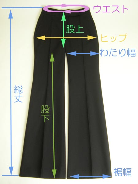 ●●● パンツ ●●● ※ウエストは立体採寸・それ以外は置いた状態で採寸しています ・ウエスト…ウエストラインに添って内側一周の長さを計測 ・ヒップ…ファスナーを閉じた状態で、ファスナーの開き止まり部分の 両脇幅を計測し、それを2倍して表示 ・股下…内股合わせから縫い目に沿って裾までの長さを計測 ・股上…内股合わせから縫い目に沿ってウエストまでの長さを計測 ・わたり幅…内股合わせに接する部分のから横に直線で幅を計測 ・裾幅…片足裾の幅を計測 |
